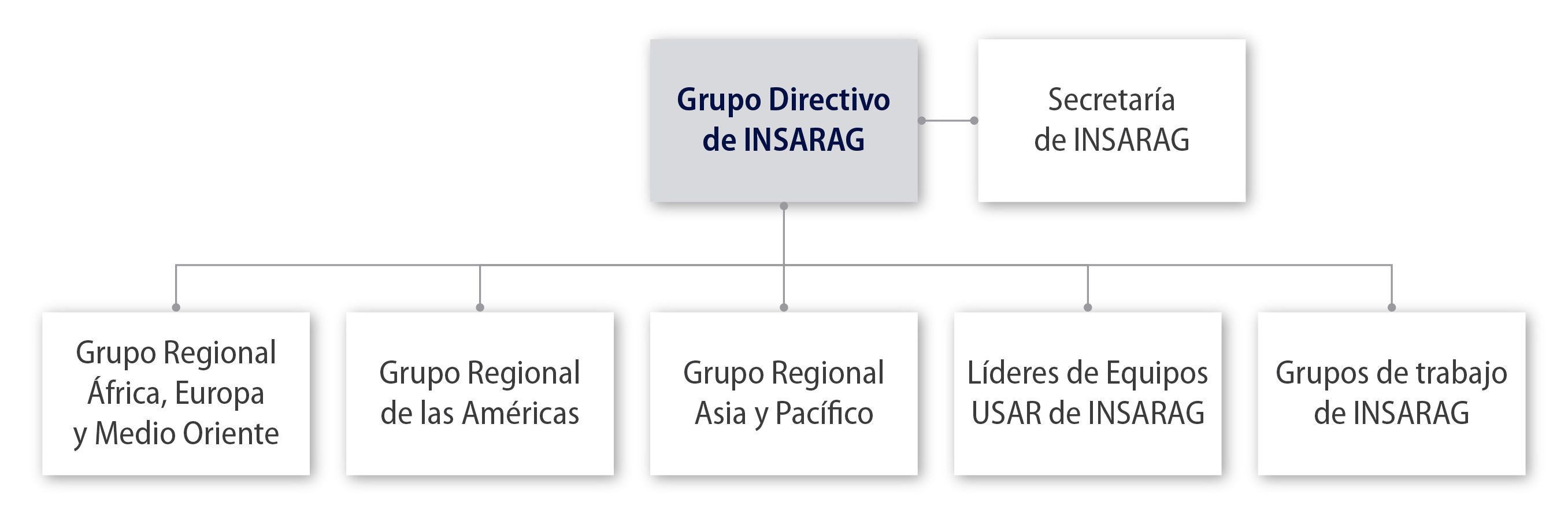 Esta estructura asegura que lo puedan alcanzar las metas de INSARAG a nivel regional, al tiempo que asegura la apropiación total y que los objetivos estén alineados con las buenas prácticas definidas y acordadas por la red mundial.