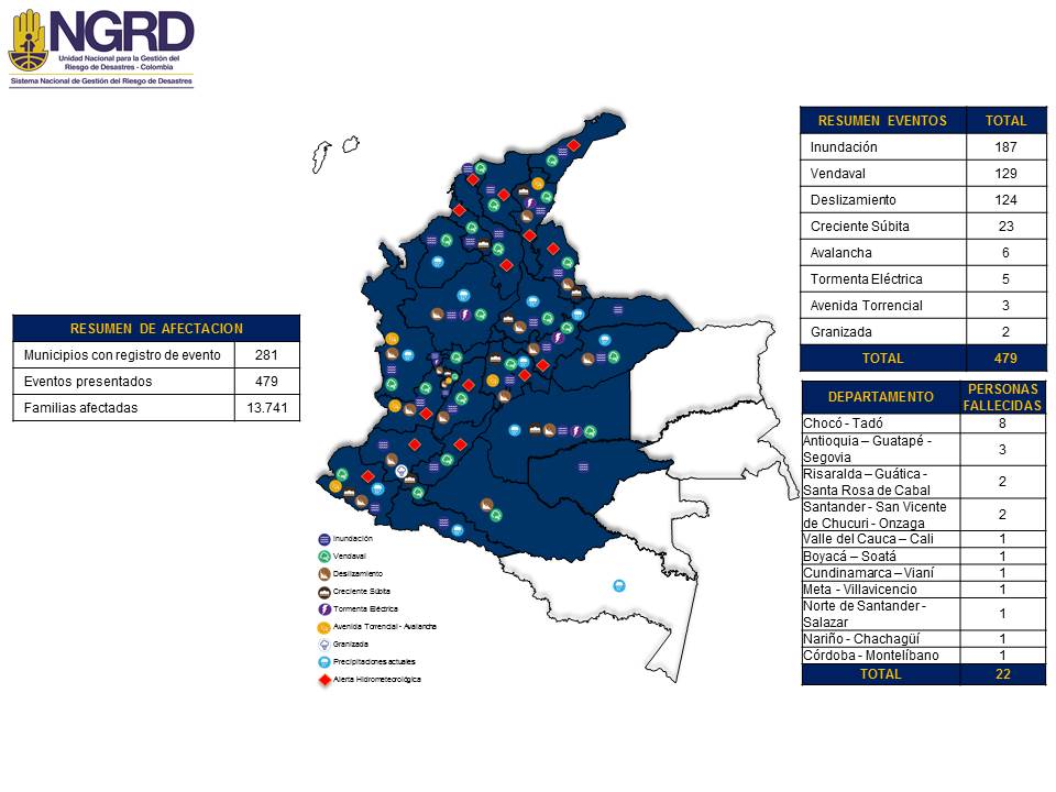 El reporte al día de hoy de la Sala de Crisis Nacional indica que: se han registrado 187 inundaciones, 129 vendavales, 124 deslizamientos, 23 crecientes súbitas, 6 avalanchas, 5 tormentas eléctricas, 3 avenidas torrenciales, 2 granizadas, para un total de 479 eventos.